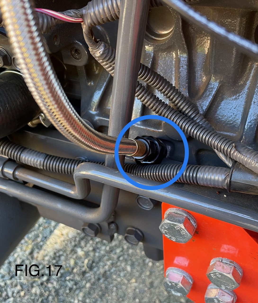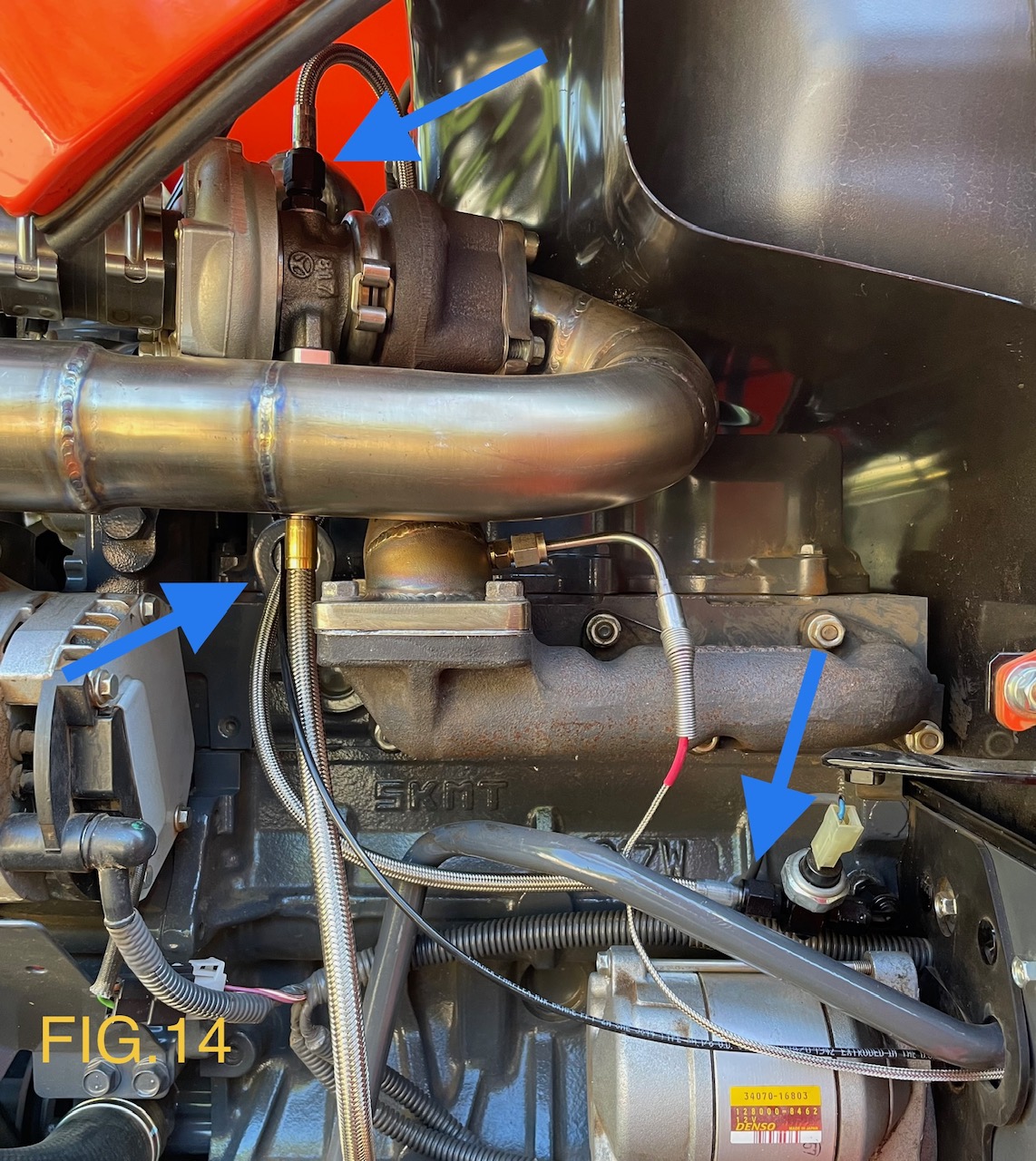 14). Install supplied steel braided 4AN oil feed hose assembly to Turbocharger and 4AN sensor port (add small amount of high temperature Teflon sealant to threads). We found it best to route the hose through engine lift hook