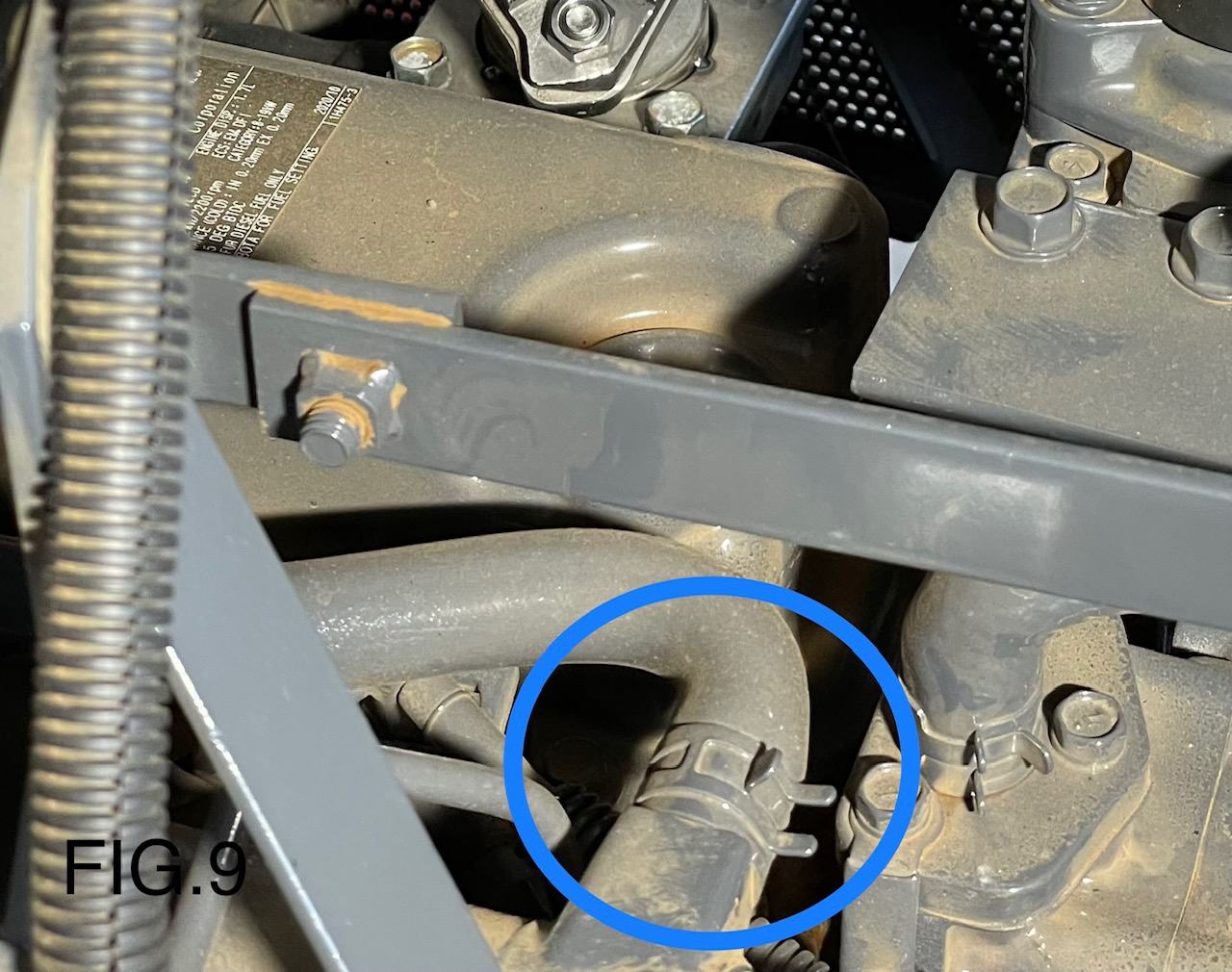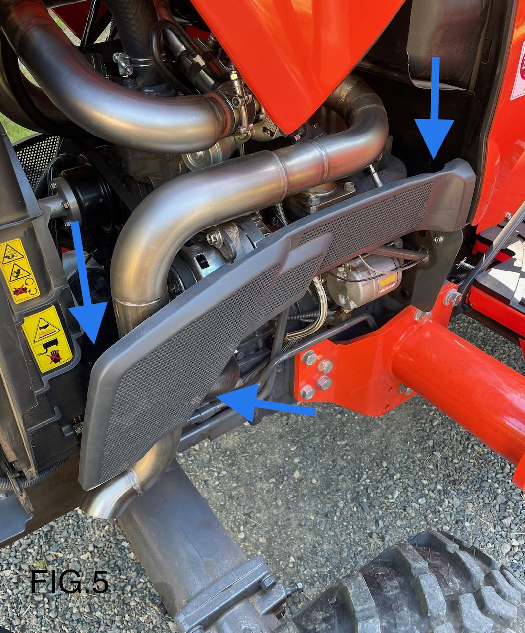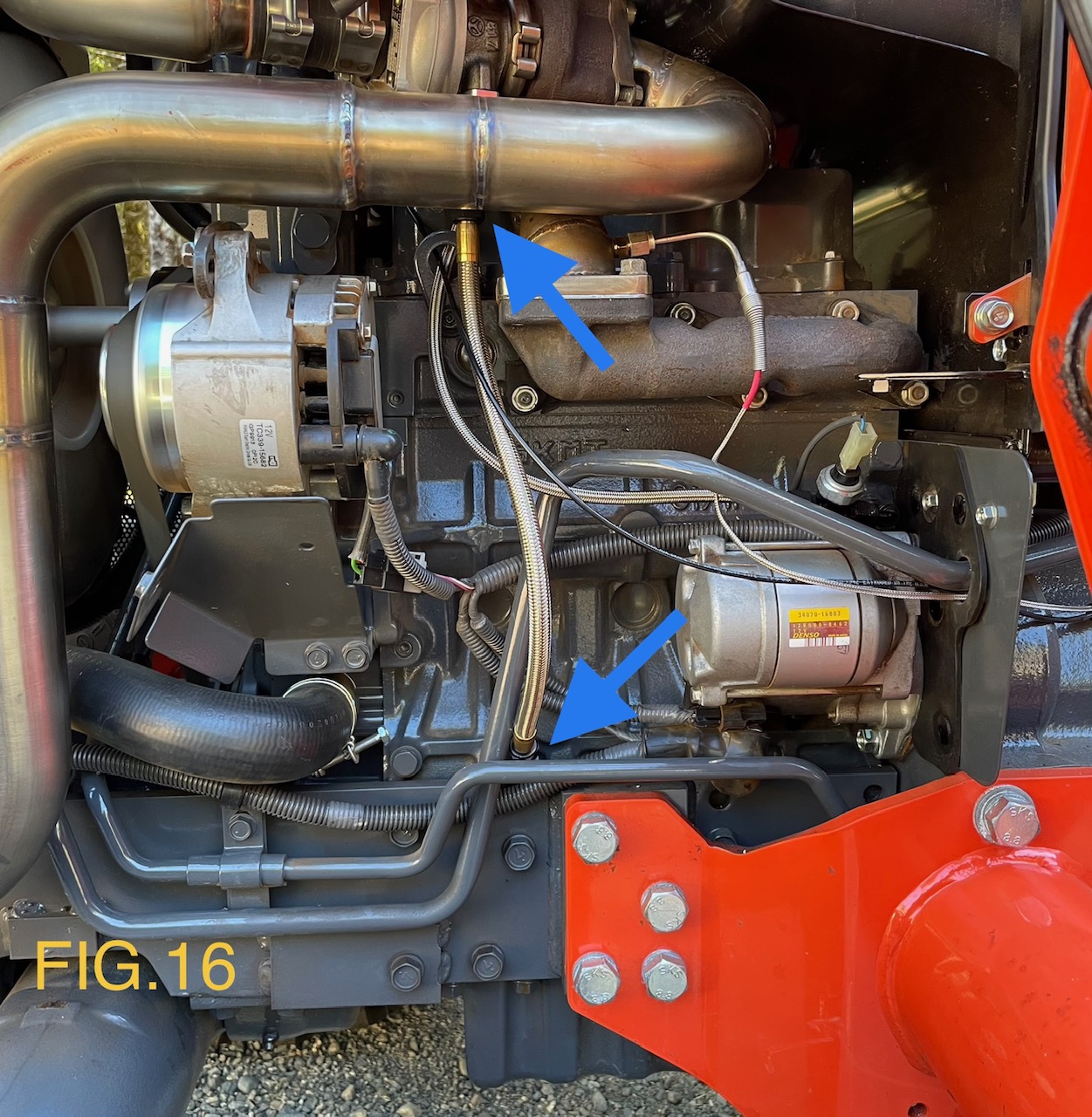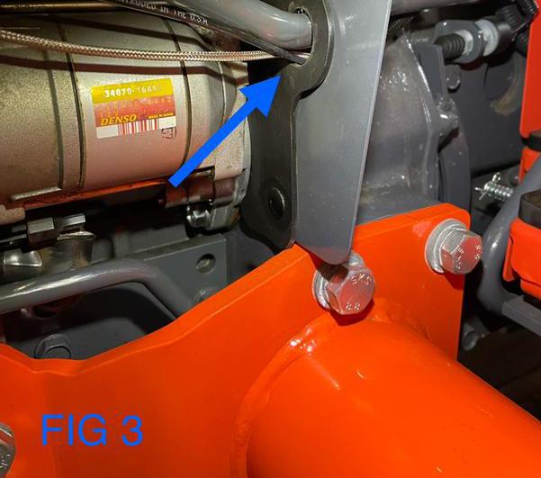 13). Install the complete Turbocharger assembly to engine exhaust manifold using OEM bolts (add small amount of anti-seize to threads) and the supplied OEM gasket. On L3240 tractors, remove the lower radiator hose shield, turn it upside down and reinstall. Then attach downpipe bracket.