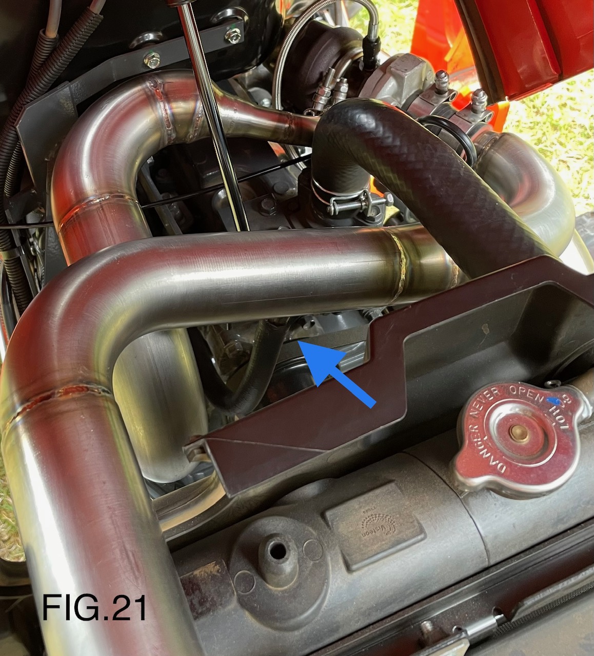 21). Install Turbo Charge pipe to intake manifold using supplied silicone hoses (Part #2700 & #2708) and clamps (Part #2787 & #2792). You may need to trim silicone hoses for proper fitment