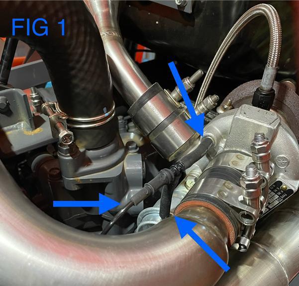 2). Remove OEM Mitsubishi Turbocharger vacuum hose and clamps located between the Turbocharger housing and actuator. See Fig 1
