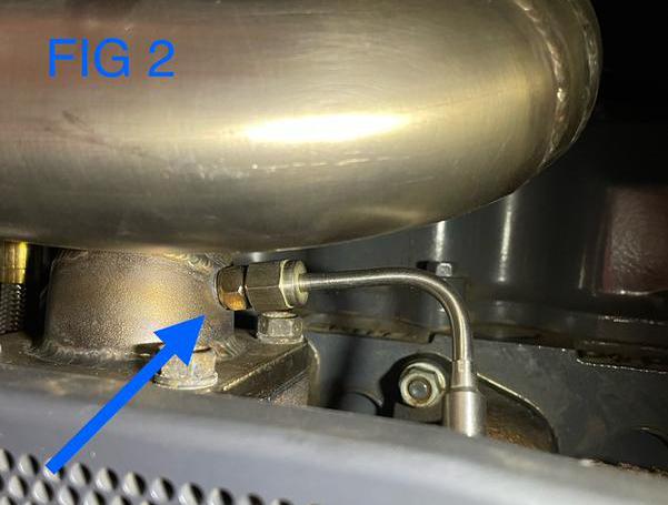 5). Remove the EGT plug/bolt located on the S2T Performance exhaust manifold Turbocharger adapter. See Fig 2