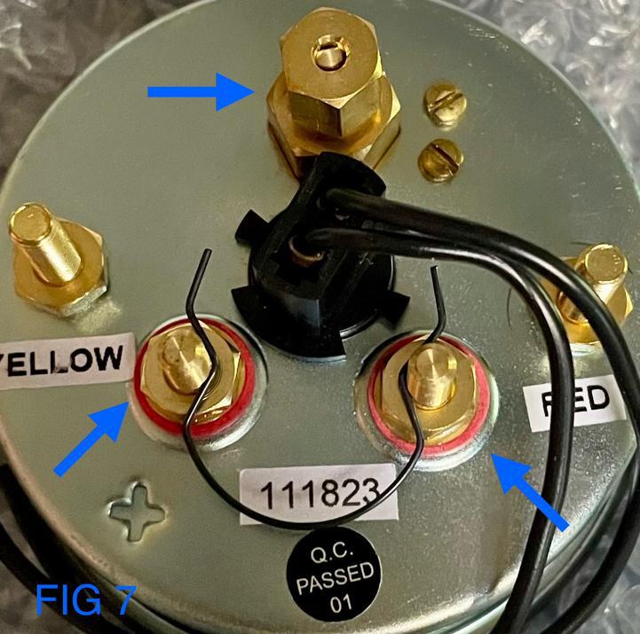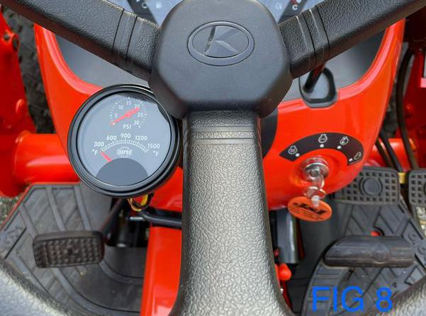 11). Install the vacuum hardline to the compression fitting on the IssPro gauge. Then, install the EGT probe wiring (Red/Yellow) to the correct terminals on the IssPro gauge as directed by the factory manual (optional - if you operate your tractor in dark conditions, you can connect the IssPro gauge light to your factory light switch following the instructions provided with the gauge). See Fig 7